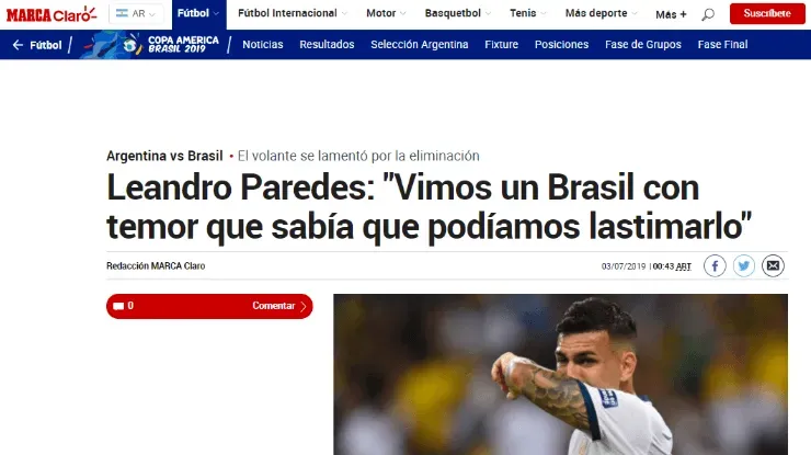 Manifestando toda su impotencia ante los méritos hechos por ambos elencos nacionales, el hombre del PSG señaló: “Duele mucho por la Copa que hicimos, fuimos de menor a mayor. Fue casi todo nuestro y ellos no generaron casi nada”. “Vimos un equipo con temor que sabía que podíamos lastimarlo”, agregó con respecto a la actuación de Brasil.