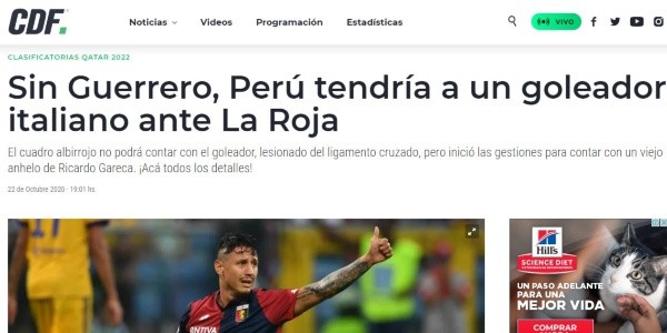 Aunque la posibilidad de la convocatoria de Gianluca Lapadula por parte del comando técnico de la selección peruana todavía no es concreta, en Chile (rival de Perú en la tercera fecha de las Eliminatorias) ya especulan con su llamado.
