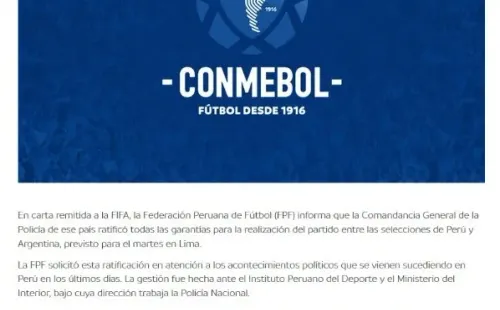 “La Federación Peruana de Fútbol (FPF) informa que la Comandancia General de la Policía de ese país ratificó todas las garantías para la realización del partido entre las selecciones de Perú y Argentina, previsto para el martes en Lima”, aseguraron en el comunicado los del ente más importante del fútbol sudamericano.