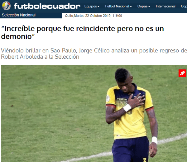 Es que para la Fecha FIFA de noviembre podría volver a vestir la camiseta de La Tri Robert Arboleda, que no solo estuvo involucrado en el escándalo del Piso 17 tras la eliminación de la última Copa América, sino también en la fiesta que tuvo lugar en Quito previo al duelo de Eliminatorias rumbo al Mundial de Rusia contra Argentina.