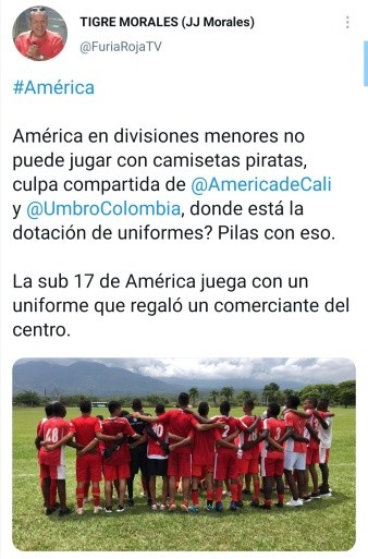Pues aparentemente, el equipo Sub-17 de América de Cali no habría recibido la dotación de uniformes y utilería por parte de la marca patrocinadora Umbro, razón por la que un seguidor ‘Escarlata’, comerciante del centro de Cali, tuvo que hacer de patrocinador y proporcionó los uniformes.