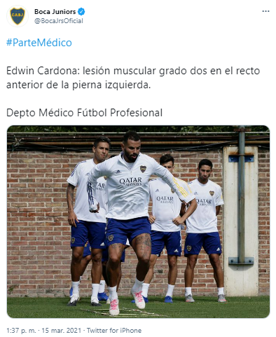 Confirmando la lesión de Cardona a través de sus principales canales de comunicación, Boca, adjuntando una postal del protagonista en cuestión, confirmó que el malestar que aqueja Cardona desde hace varias jornadas se transformó en una“lesión muscular de grado dos en el recto anterior de la pierna izquierda”.