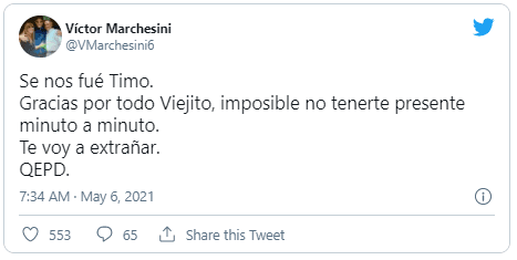 Alrededor de las 7:30 de la mañana de este jueves lo confirmó su yerno, Victor Marchesini, en su cuenta oficial de Twitter: “Se no fue Timo. Gracias por todo viejito, imposible no tenerte presente minuto a minuto. Te voy a extrañar”. Timoteo perdió la vidaen el Sanatorio Los Arcos, en Palermo, donde estuvo internado durante varias semanas.