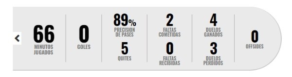 Su calificación fue un 5, masomenos el promedio del equipo. Resaltaron también que tuvo un 89% en la precisión de sus pases y ganó 4 duelos ¡Bien Kaiser! ¡A seguir mejorando!