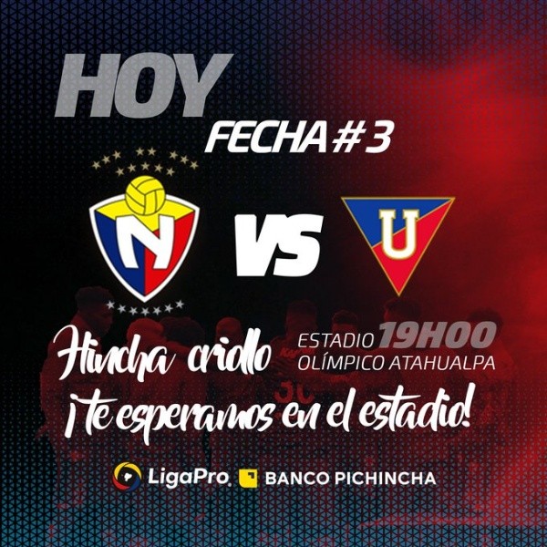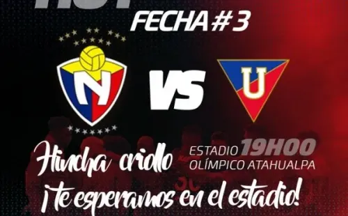 El partido deEl Nacional vs. Liga de Quito por la tercera jornada de la primera ronda de la LigaPro de Ecuador será este viernes 28 de febrero en el Estadio Olímpico Atahualpa.
