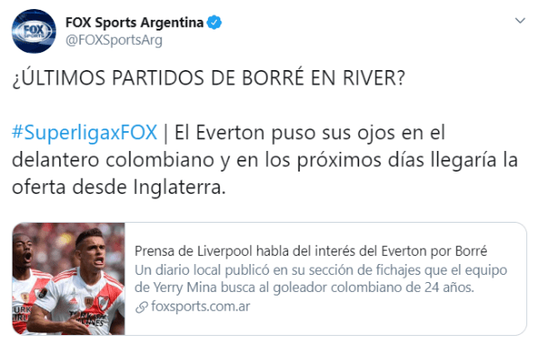 El club más interesado en los goles del ‘Comandante’ es el Everton, equipo en el juega Yerry Mina. Ahí estaria el próximo destino de Rafa Borré. Antes de llegar a River, el colombiano había jugado en España con el Atlético de Madrid y el Villarreal.