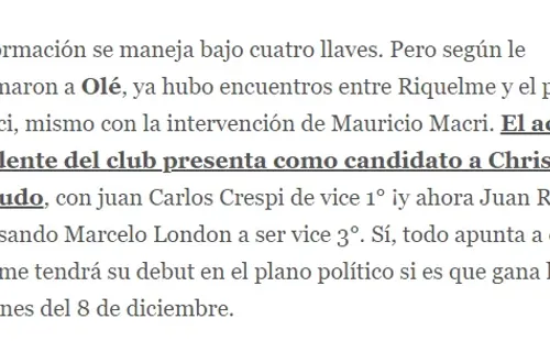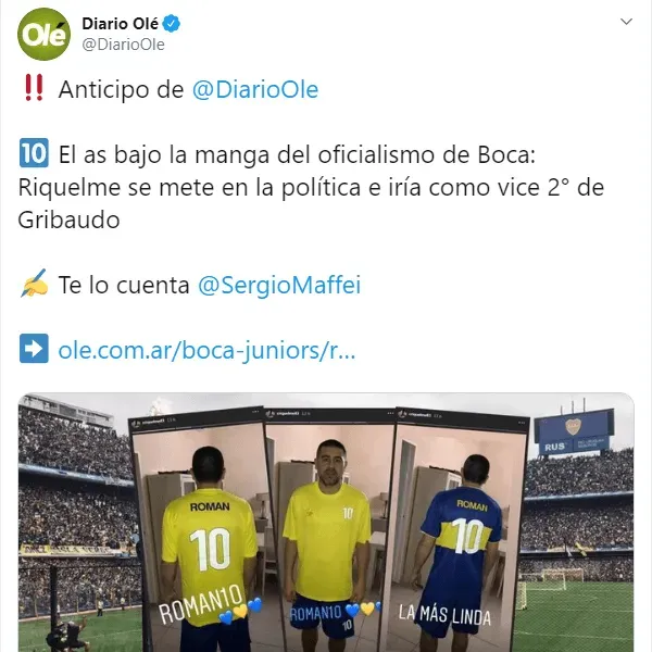 “Anticipo de Diario Olé: el as bajo la manga del oficialismo de Boca: Riquelme se mete en la política e iría como vice segundo de Gribaudo“, había puesto el medio deportivo más importante de Argentina en las redes sociales.