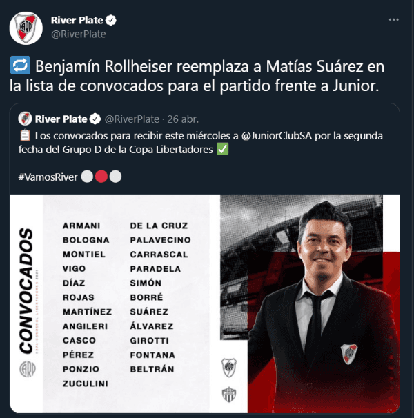 Sin embargo, la formación del barrio porteño de Núñez no tiene demasiado tiempo para lamentarse. Es que, este miércoles, por la segunda fecha de la fase de grupos de la Copa Libertadores de América, deberá recibir a Junior de Barranquilla en el propio estadio Antonio Vespucio Liberti. Lo hará luego de haber debutado con un 1-1 como visitante de Fluminense.