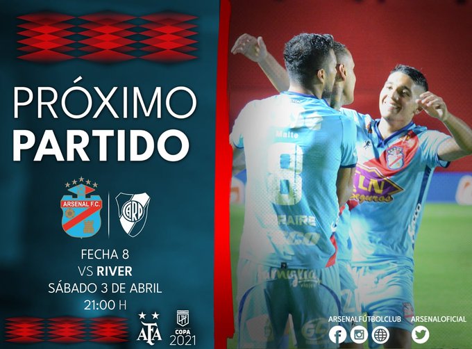 Arsenal y River Plate se enfrentarán el sábado3de abril. El duelo entre ambas escuadras está pactado a las 21:00 horas (hora de Argentina) y tendrá lugar en el Estadio Julio Humberto Grondona.