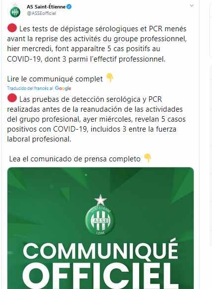 Este jueves, entonces, a través de un comunicado, Saint Etienne confirmó que 5 casos resultaron positivos en COVID-19. Ellos, de todas maneras, prefieren mantener el anonimato.