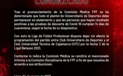 Las autoridades de la Liga 1 decidieron que el encuentro entre Universitario y UTC de Cajamarca por la tercera fecha del campeonato sea suspendido debido a los 11 casos de positivos por coronavirus en el plantel crema.