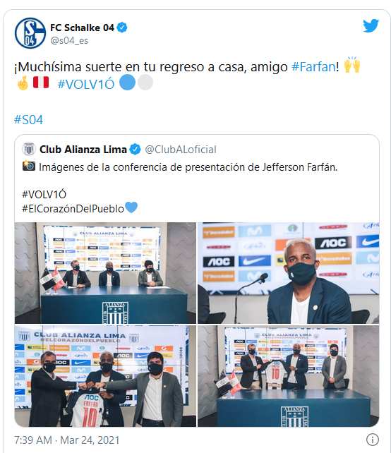 “¡Muchísima suerte en tu regreso a casa, amigo #Farfan!“, escribieron los alemanes en un mensaje retwitteando la presenteción de la Foquita en el club victoriano.