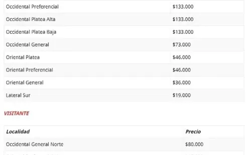 Cabe destacar también el importante aumento que tuvo la entrada para adulto en la tribuna familiar (lateral norte) que de 15 mil pasó a 36 mil pesos, mientras que niños y adultos mayores costará 10 mil.