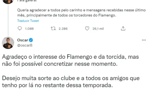 “¡Hola chicos!Me gustaría agradecer a todos el cariño y los mensajes recibidos este último mes, especialmente de todos los aficionados del Flamengo.Agradezco el interés de Flamengo y de la afición, pero no fue posible hacerlo en ese momento. Le deseo la mejor de las suertes al club y a todos los amigos que tengo allí para lo que queda de temporada“, publicó el futbolista en Twitter.