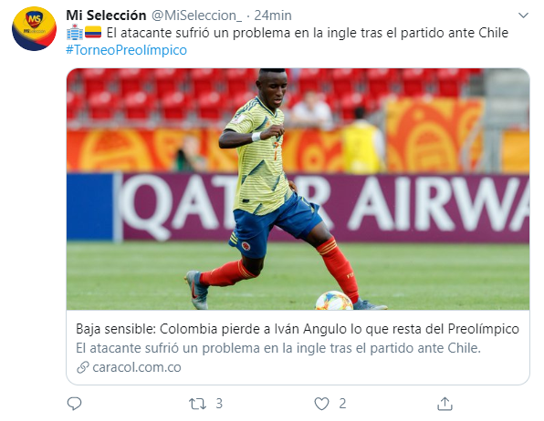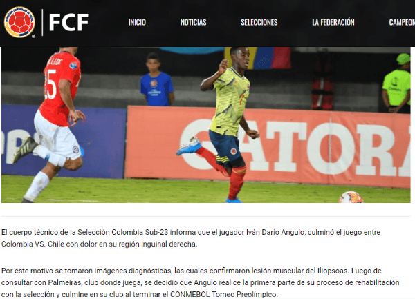 “El cuerpo técnico de la Selección Colombia Sub-23 informa que el jugador Iván Darío Angulo, culminó el juego entre Colombia VS. Chile con dolor en su región inguinal derecha. Por este motivo se tomaron imágenes diagnósticas, las cuales confirmaron lesión muscular del Iliopsoas”, reza el comunicado.