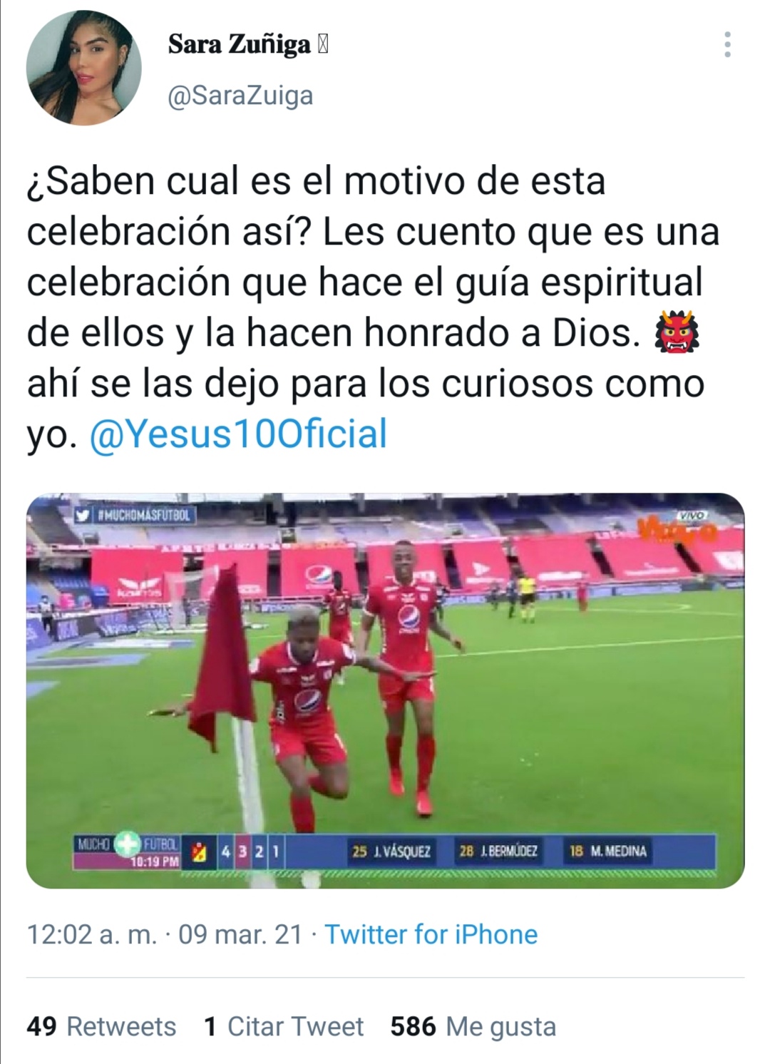 Tras sus goles, el Diez ha celebrado junto con sus compañeros y la curiosidad de los hinchas ‘Escarlatas’, con respecto a su celebración, se ha despertado. La celebración es por el guía espiritual del equipo que lo hace honrando a Dios, así mismo es cuando Yesus junta las manos.