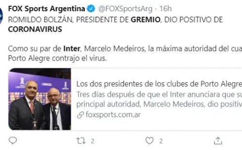 Días después, quien arrojó positivo en el testo fue Romildo Bolzan, de Gremio, quien también se puso en aislamiento en su casa, sin presentar sintomas.