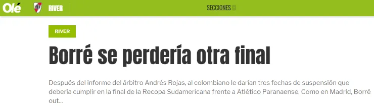 En consecuencia, al ser la Recopa una competencia Conmebol, además de perderse el último partido de la fase de grupos de la actual Libertadores vs. Internacional, Borré también podría llegar a estar ausente para los compromisos coperos anteAtlético Paranaense.