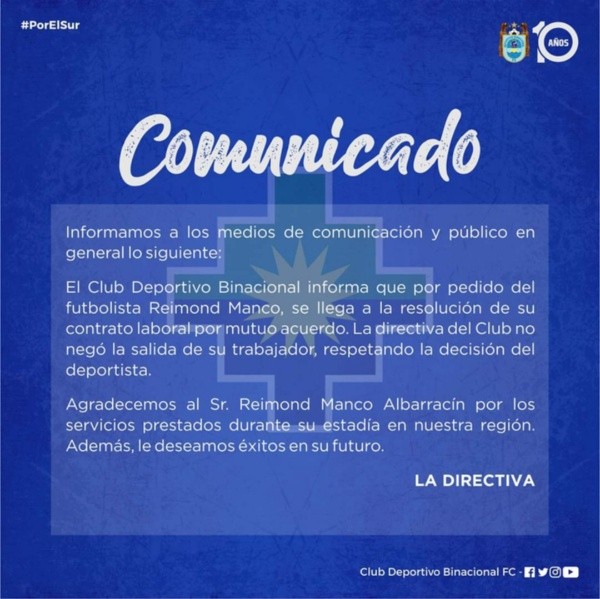 El Poderoso del Sur sacó un comunicado informando la desvinculación de Reimond Manco. Según su versión, esto fue por común acuerdo.