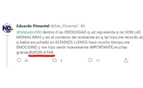 Como era de esperar, la grabación se hizo muy viral y llegó a las redes de Eduardo Pimentel. El directivo no se quedó callado y con su estilo reaccionó directo y tildó a ‘Matador’ de “Bufón de las FARC”.Además, le agradeció irónicamente porque sus insultos le hicieron recordar sus épocas de futbolista.