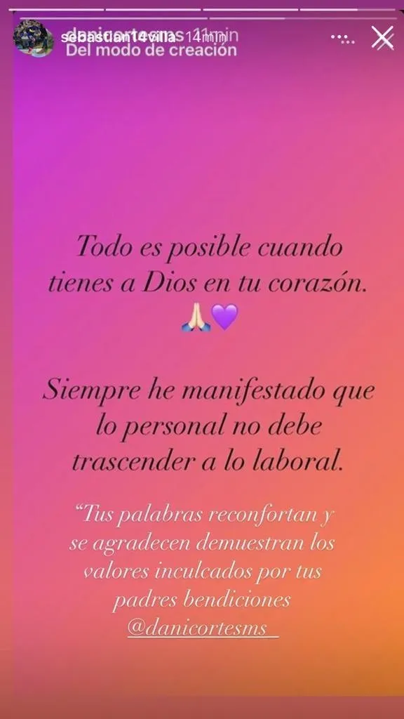 En todo caso, el jugador sorprendió en sus redes sociales por una publicación relacionada con su exnovia, Daniela Cortés. Hace unos días, ella publicó un mensaje presuntamente relacionado con la situación que vive Sebastián Villa en Boca: “Lo personal no debe trascender lo profesional”.