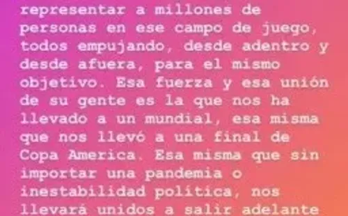 Agregó: “Esa fuerza y esa unión de su gente es la que nos ha llevado a un Mundial, esa misma que nos llevó a una final de Copa América. Esa misma que sin importar una pandemia o una inestabilidad política, nos llevará unidos a salir adelante nuevamente para un futuro mejor. Nunca dejemos de luchar, nunca dejemos de creer en que todos juntos podremos lograr que el Perú salga adelante a pesar de cualquier adversidad. Hoy y siempre arriba Perú”.