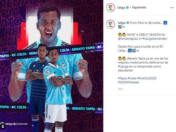 No solo recibe elogios de los hinchas y la prensa, el también volante de la selección peruana fue destacado por la cuenta oficial de Instagram de LaLiga: “Desde Perú para triunfar en el RC Celta… ¡Renato Tapiaya es uno de los mejores mediocentros defensivos de LaLigaen su temporada como debutante!”.