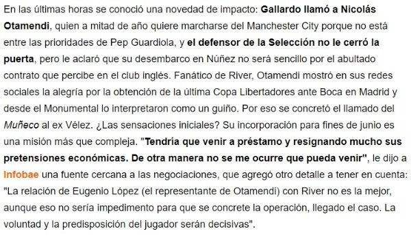 El mismo medio de comunicación indicó que Otamendi aclaró que su llegada a River no es para nada fácil, pero, al mismo tiempo, no cerró ninguna puerta. ¿La traba principal? Su elevado contrato en Inglaterra.