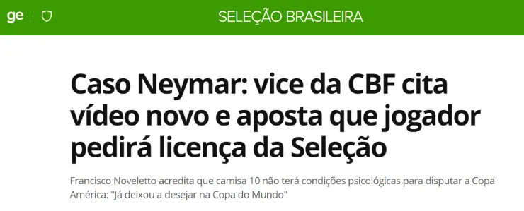 Según reveló Globo Esporte,Francisco Noveletto, vicepresidente de la Confederación Brasileña de Fútbol, reveló: “Si Neymar juega, Brasil no va a conseguir el título. Sé de la presión que tendrá y cómo la prensa estará encima suyo. Hay muchas más cosas por aparecer… Un amigo mío en Río de Janeiro me dijo que hay otro video que está a punto de salir a la luz”.