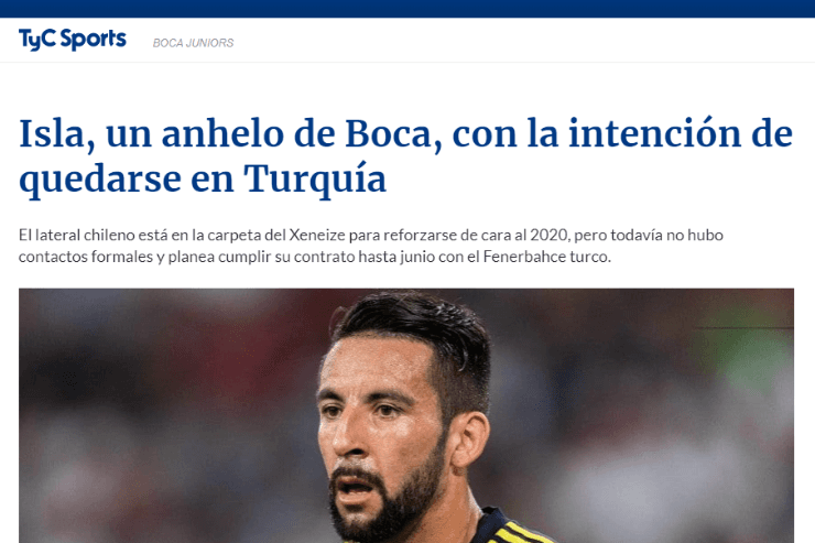 Si bien todo indicaba que las negociaciones con el jugador chileno serían más fáciles de encarar que las de su compatriota Charles Aránguiz, TyC Sports reportó a través de su sitio web que finalmente Isla habría decidido continuar en elFenerbahçe.