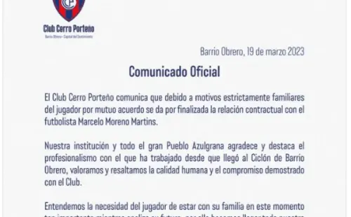 “El Club Cerro Porteño comunica que debido a motivos estrictamente familiares del jugador por mutuo acuerdo se da por finalizada la relación contractual con el futbolista Marcelo Moreno Martins. Nuestra institución y todo el gran Pueblo Azulgrana agradece y destaca el profesionalismo con el que ha trabajado desde que llegó al Ciclón de Barrio Obrero, valoramos y resaltamos la calidad humana y el compromiso demostrado con el club“, anunció Cerro Porteño.