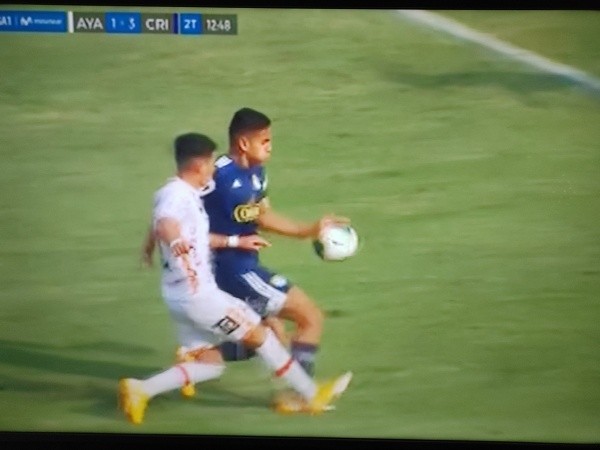 Cuando Sporting Cristal vencía 3-1, una acción de gol de Ayacucho FC terminó en la mano del defensor celetesGianfranco Chávez. La acción no fue cobrada y terminó como una de las polémicas de la semifinal de vuelta.