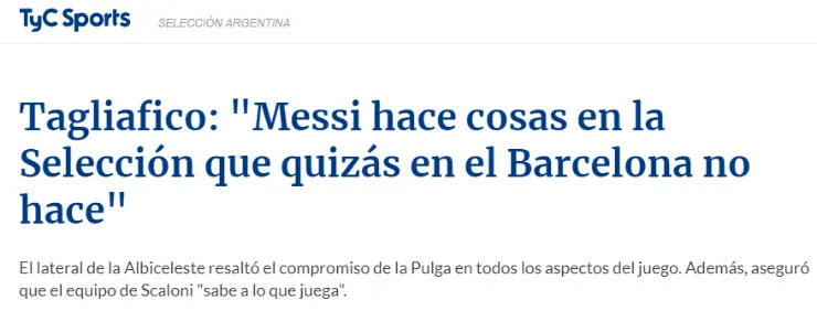 En diálogo con TyC Sports, Nicolás Tagliafico, haciendo referencia a la predisposición de los deportistas en este nuevo ciclo que comanda Scaloni, sintetizó: “Estamos acá para ayudarnos entre todos, por el bien de Argentina. Si el entrenador decide ponerme en otra posición lo haré. Quiero lo mejor para la Selección”.