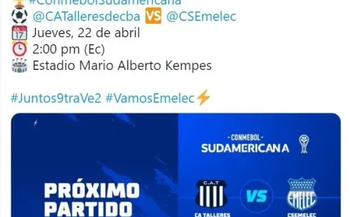 El juego entreTalleres y Emelec se realizará estejueves 22de abril en el Estadio Mario Alberto Kempes.
