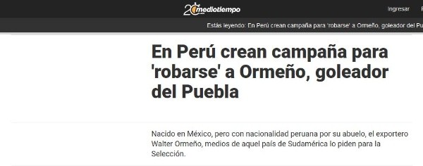 “En Perú crean campaña para ‘robarse’ a Ormeño, goleador del Puebla”, titularon en Mediotiempo. En aquella nota, citaron tweets de Depor y RPP noticias en donde lo tildan de peruano.