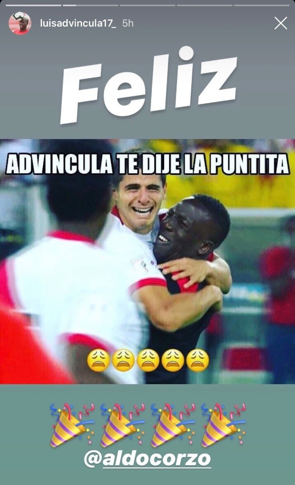 La siguiente foto tiene la misma tónica. El que juega en España abraza al Crema y este sale gritanto. “Advíncula otra vez”, coloca en la historia de Instagram. Así, queda claro que se llevan bien y hasta bromean al respecto. Desde acá, nos alegre y, hay que decirlo, nos da mucha gracia.