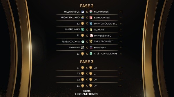Un total de 13 equipos aguardan para la Fase 2 de la Copa Libertadores. A esta instancia se sumarán los ganadores de la Fase 1 más el tercer clasificado del fútbol colombiano (Colombia 3), que aún no está definido. De esta forma, los emparejamientos arrojaron Deportivo Cali-Fluminense, Audax Italiano-Estudiantes, E2-U.Católica Ecuador, América-Guaraní, E1-Universitario, Plaza Colonia-The Strongest, Everton-Monagas y E3-Atlético Nacional.