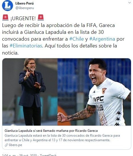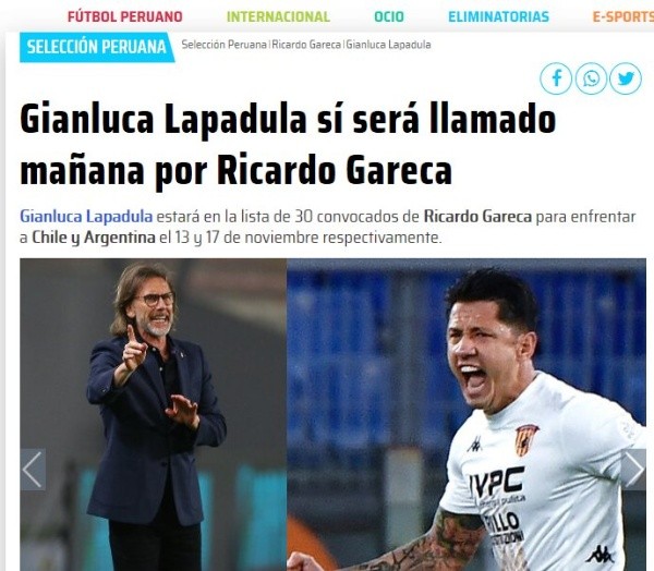 “Luego de recibir la aprobación de la FIFA, Gareca incluirá a Gianluca Lapadula en la lista de 30 convocados para enfrentar a Chile y Argentina por las Eliminatorias”, escribieron en el conocido diario.