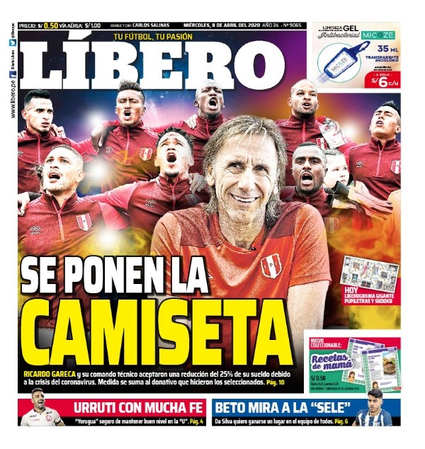Y es que según la última portada de Líbero, “Ricardo Gareca y su comando técnico aceptaron una reducción del 25% de su sueldo debido a la crisis del coronavirus”.