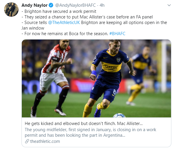 Andy Naylor, periodista de un diario de la ciudad de Brigthon, avanzó que el club inglés permitirá que Alexis Mac Allister continúe en el Xeneize hasta que finalice el préstamo, evitando así pagar un resarcimiento económico por finiquitar el vínculo antes del tiempo establecido.