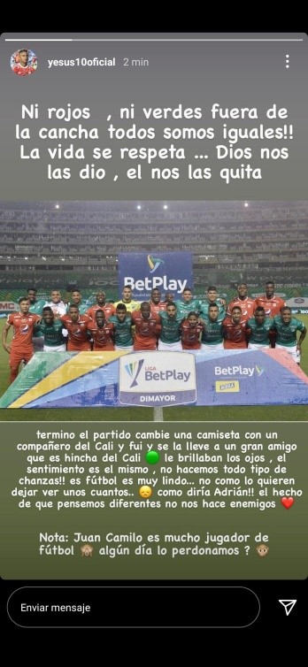 “Ni rojos, ni verdes, fuera de la cancha todos somos iguales. La vida se respeta, Dios nos la dio, él no la quita. Terminó el partido contra Cali, cambié una camiseta con un compañero del Cali y se la llevé a un gran amigo que es hincha del Cali. Le brillaban los ojos, el sentimiento es el mismo, nos hacemos todo tipo de chanzas. El fútbol es muy lindo, no como lo quieren ver unos cuantos. Nota: Juan Camilo es mucho jugador de fútbol, ¿algún día lo perdonamos?”