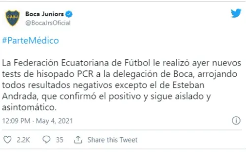 Pese a que la situación parece irreversible, desde Boca aseguran que las gestiones se están haciendo con la embajada argentina en Ecuador. Cabe destacar que, pese a haber contraído el virus, Andrada se siente bien yes asintomático. ¡Fuerza, Esteban!