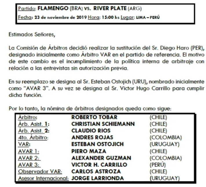 La Confederación Sudamericana hizo oficial la exclusión deDiego Haro, quien había sido nombrado como encargado del VAR.