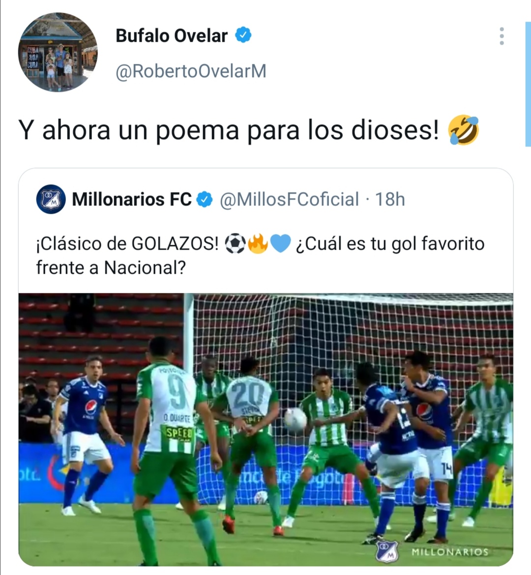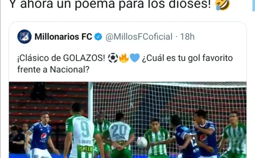 Pero también, los jugadores que han sido parte de este clásico lo hicieron saber, pues en primer lugar Atlético Nacional publicó cuatro fotos para calentar el clásico, a lo que Millonarios respondió con un video de sus mejores goles contra el ‘Verdolaga’ y de paso Ovelar se burló de Nacional con alusión al día de la poesía.