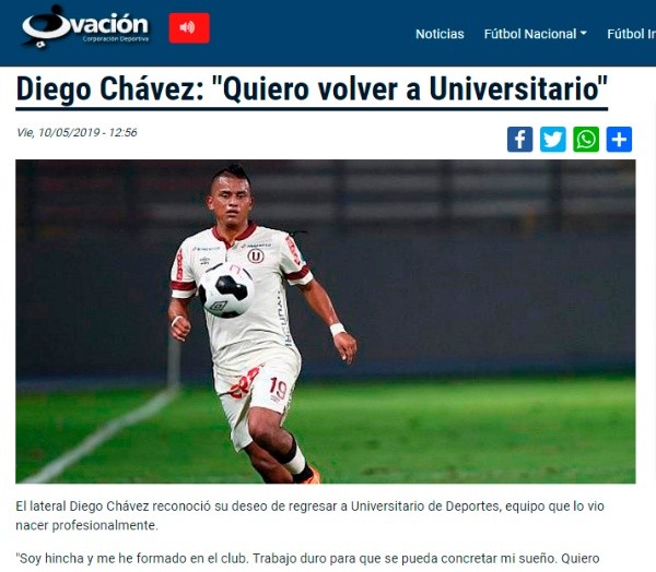 Universitario de Deportes se encuentra concentrado con la intención de sumar la mayor cantidad de puntos en cara al Torneo Clausura y ante esta situación el defensor Diego Chávez habló sobre un posible retorno a la institución que vio sus primeros pasos.
