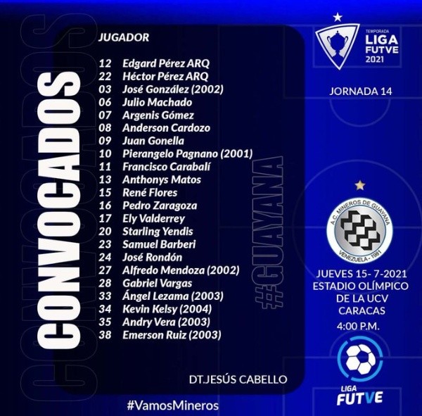 Mineros de Guayana, por su lado, sabe que sumar le dejará una mejor colocación en la tabla y por tal motivo, se esforzará para lograr los tres puntos. Los visitantes acuden a esta cita tras ganarle 2 a 1 al conjunto de LALA.