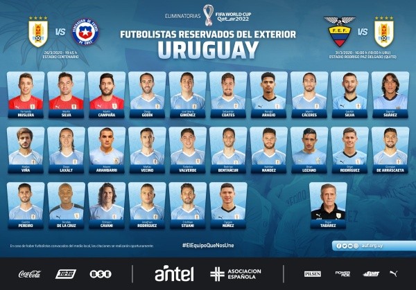 El debut de La Celeste en las Eliminatorias Sudamericanas tendrá lugar el 26 de marzo, en el Estadio Centenario de Montevideo, ante Chile. El 31, saldrá de visitante para enfrentar a Ecuador en el Estadio Rodrigo Paz Delgado de Quito.