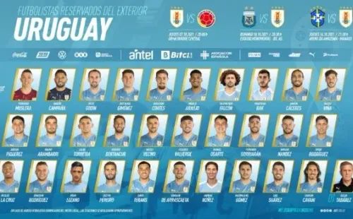 El maestro Tabárez reservó a 30 futbolistas del exterior, dentro de los cuales se destaca Edinson Cavani, el delantero del Manchester United, que no fue tenido en cuenta para la ventana de septiembre, y del que en su momento el seleccionador manifestó que no fue llamado por estrategia.