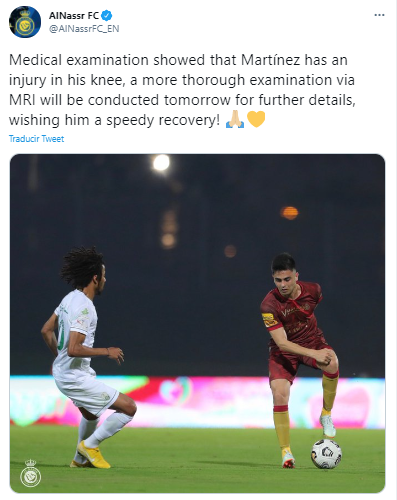 “El examen médico mostró que Martínez tiene una lesión en la rodilla, mañana se realizará un examen más completo por resonancia magnética para obtener más detalles. ¡Le deseamos una pronta recuperación!”, manifestó la institución de Arabia Saudita.