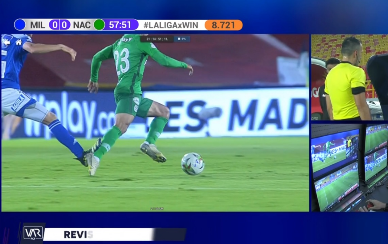 Betancurt fue a ver la imagen y se vio que el área de contacto daba para tener en cuenta y expulsar al jugador de Millonarios, pero el árbitro decidió simplemente sacarle tarjeta amarilla.